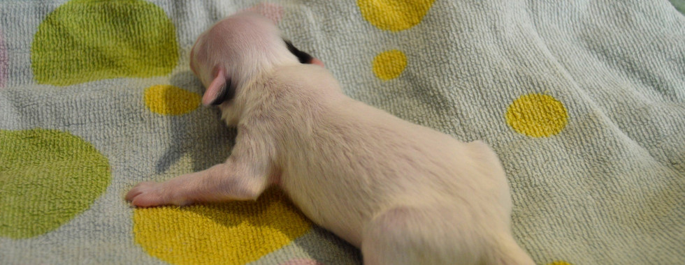 Ensimmäisenä puuterityttö, jota kutsumme lempinimellä Trio. Ilmiselvää mistä tuo nimi tulee :) Trio on nyt muutaman päivän ikäisenä jo yli 200 g painoinen ja suurin koko pesueesta. Maito on maistunut. :)